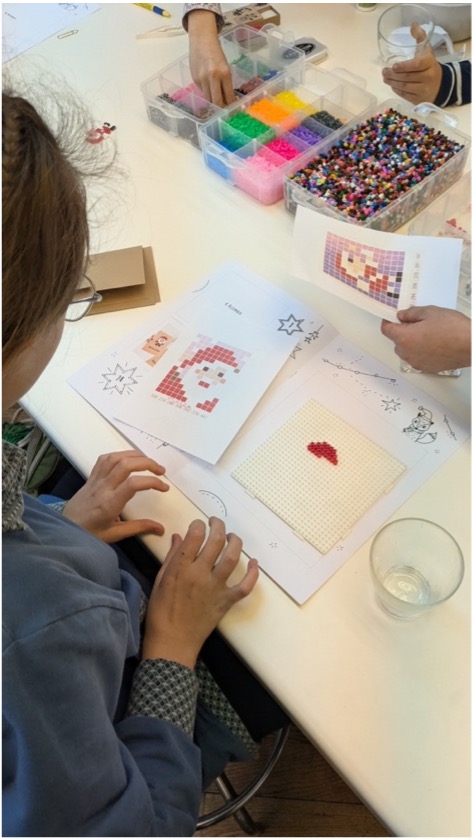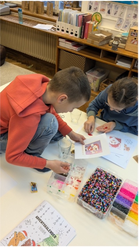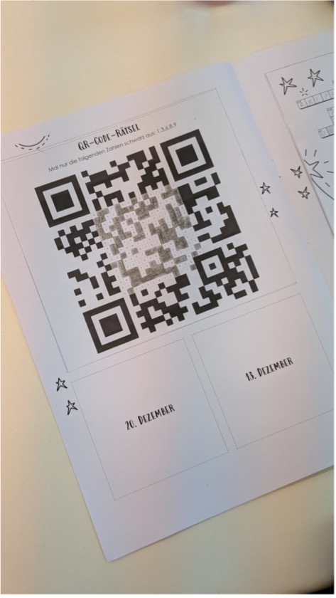 Bis jetzt waren das u.a. das Basteln einer Sternengirlande, das Lösen eines Kreuzworträtsels, das Vervollständigen eines QR-Codes, der dann zu einer Karaoke Version von Last Christmas führte (ja, nicht alle Kinder von heute kennen diesen Song ;-)) und das Gestalten einer Weihnachtskarte mittels Bügelperlen und weihnachtlichen Stempel.